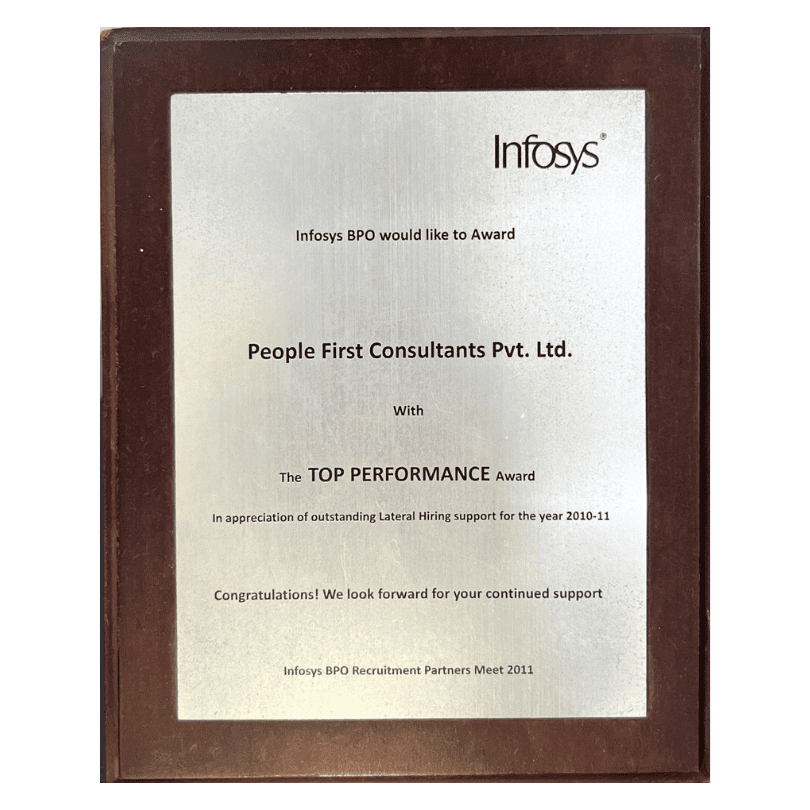 Recognized by Infosys BPO with the Top Performance Award for outstanding lateral hiring support (2010–11). A milestone that reflects our enduring commitment to excellence and partnership in talent acquisition.