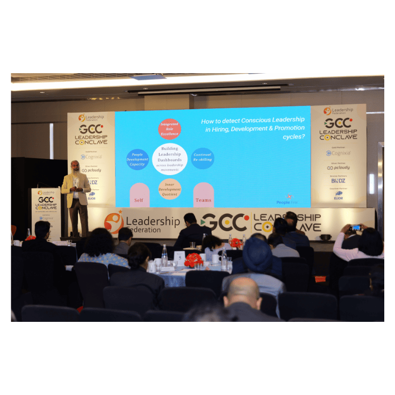 Arul Dev, Founder & CEO of People First Consultants, delivering a keynote on Conscious Leadership at the GCC Leadership Conclave — inspiring organizations to build leadership dashboards that nurture both inner and outer excellence.